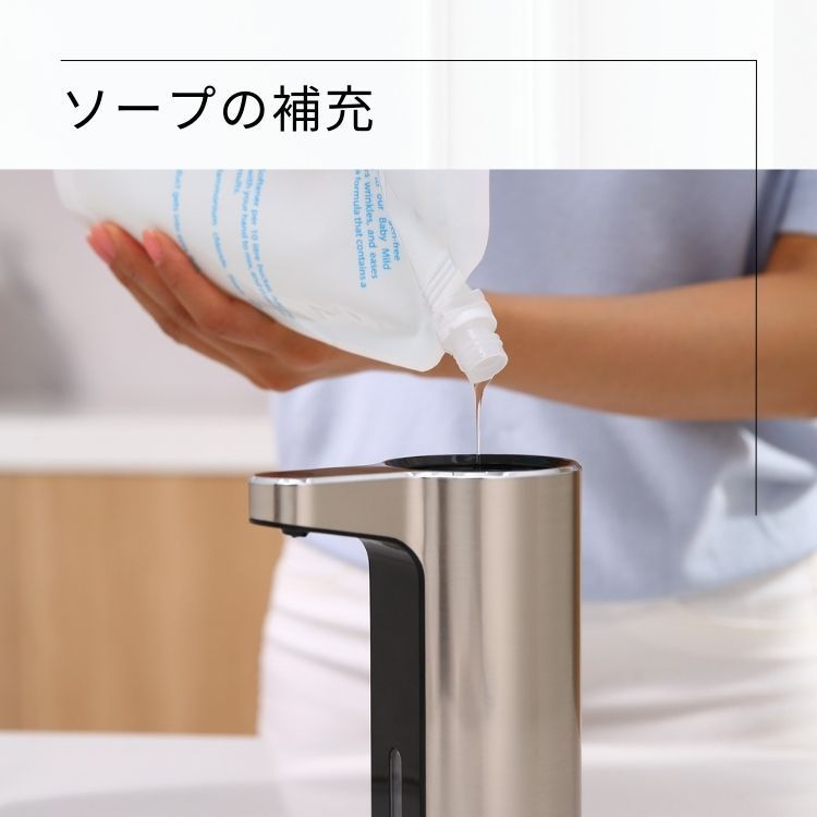 センサーに手を近づけるとソープが自動的に出てきます。さらに使用量を3段階に調整可能なので衛生的かつ経済的です。小窓からソープ残量も確認可能。