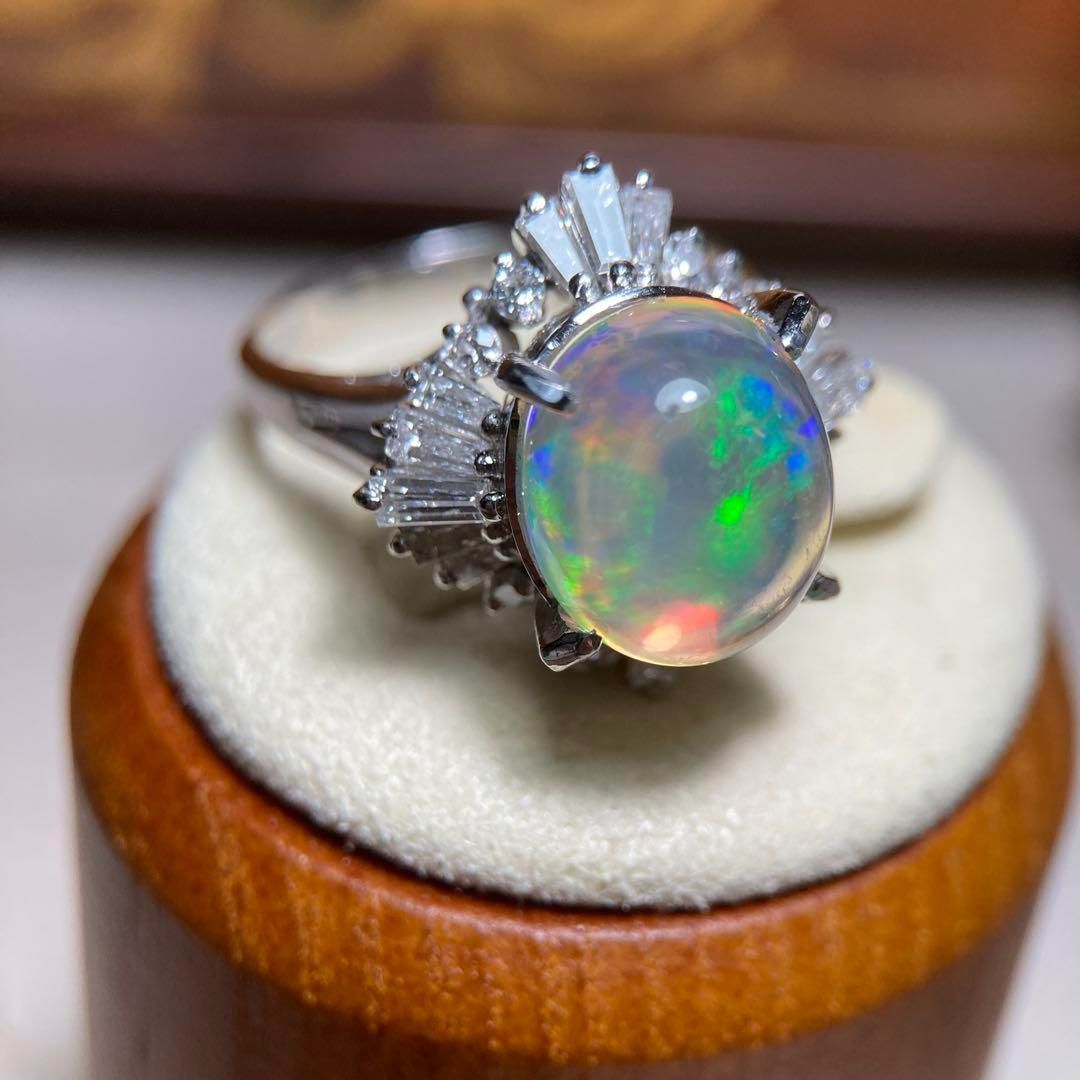 pt 900 陽刻 天然メキシコ産 ウォーターオパール 4.75 ct ダイヤモンド 1.03 ヴィンテージリング 指輪
