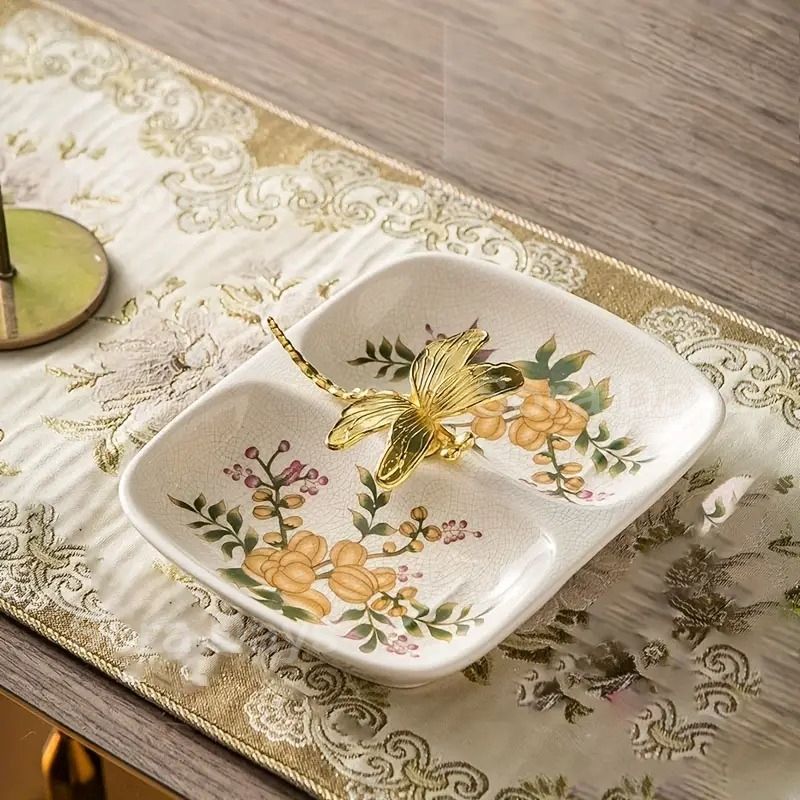 ソープディッシュ ソープホルダー 石鹸置き 花柄 トンボ おしゃれ エレガント インテリア 北欧 ヴィンテージ調 西洋風 蝶 水切り 排水 置き 角丸 ゴールド装飾 台座付き 立体モチーフ セラミック ×6 cm
