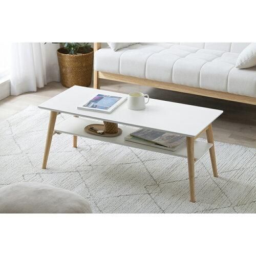 組み立て不要で、すぐに使える折り畳みセンターテーブルです。天板は斜め加工のエッジを活かしたデザインです。清潔感のあるホワイトの天板とやわらかな木目の脚がかわいいバイカラーです。天板には熱、水、傷に強いメラミン樹脂を使用しています。脚はラッカー塗装が施されており柔らかい光沢があります。棚板付きで、小物収納に便利です。棚板を外しての使用も可能です。脚が折りたたみ可能で、使わない時はコンパクトに収納できます。ワンタッチレバーで簡単に折りたためます。 天板サイズ(約):900×400mm 天板・棚板の厚み(約):15mm 棚板サイズ(約):862×220mm 天板下の高さ(約):365mm(棚板取り付け時/天板下から棚板まで:150mm、棚板下から床まで:200mm) 折りたたみ時サイズ(約):900×400×80mm(棚板含む) 耐荷重(約):全体23kg、天板20kg、棚板3kg
