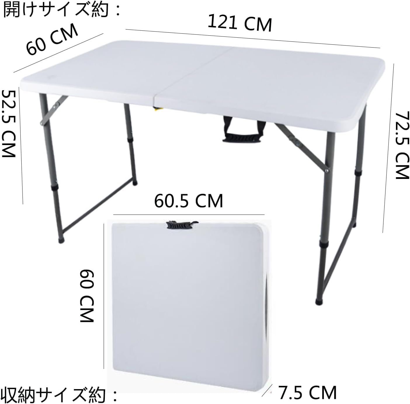 【製品仕様】122cm展開サイズ約:幅122×奥行60×高さ52/72cm、[収納時サイズ]約幅66×奥行63×高さ7cm 重量は8kg。脚部:スチール、折りたたみ時持ち運びハンドル付き。