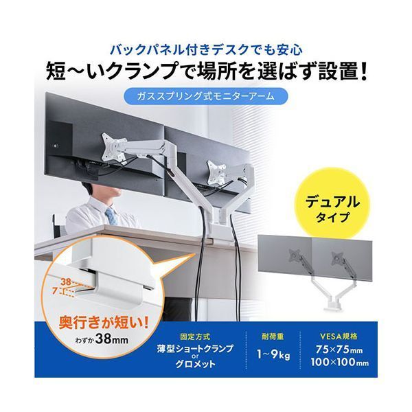 サンワサプライ モニターアーム デュアル ガススプリング式 薄型ショートクランプ ホワイト CR-
