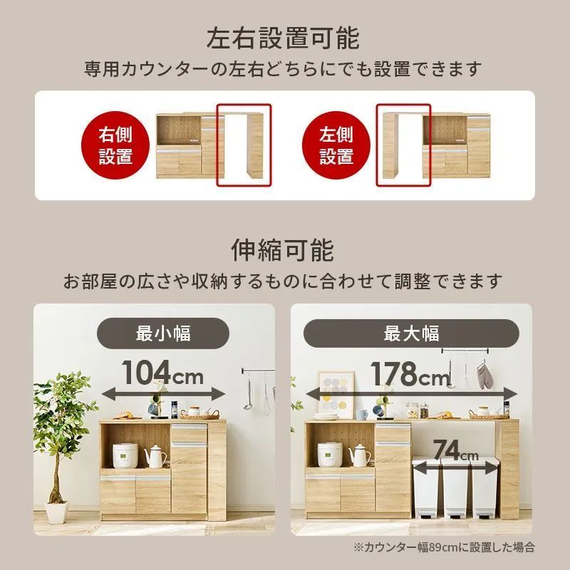 お部屋の広さや収納するものに合わせて幅を調整できるカウンターキャビネット。 食器や調理器具、キッチン家電などがスッキリ片付く大容量収納。 キッチンカウンター+拡張テーブルの得なSET。 省スペースで大活躍。専用のキッチンカウンターに「乗せるだけ」で簡単設置後付けのテーブル。 簡単に作業スペースを拡張できます。左右設置可能。
