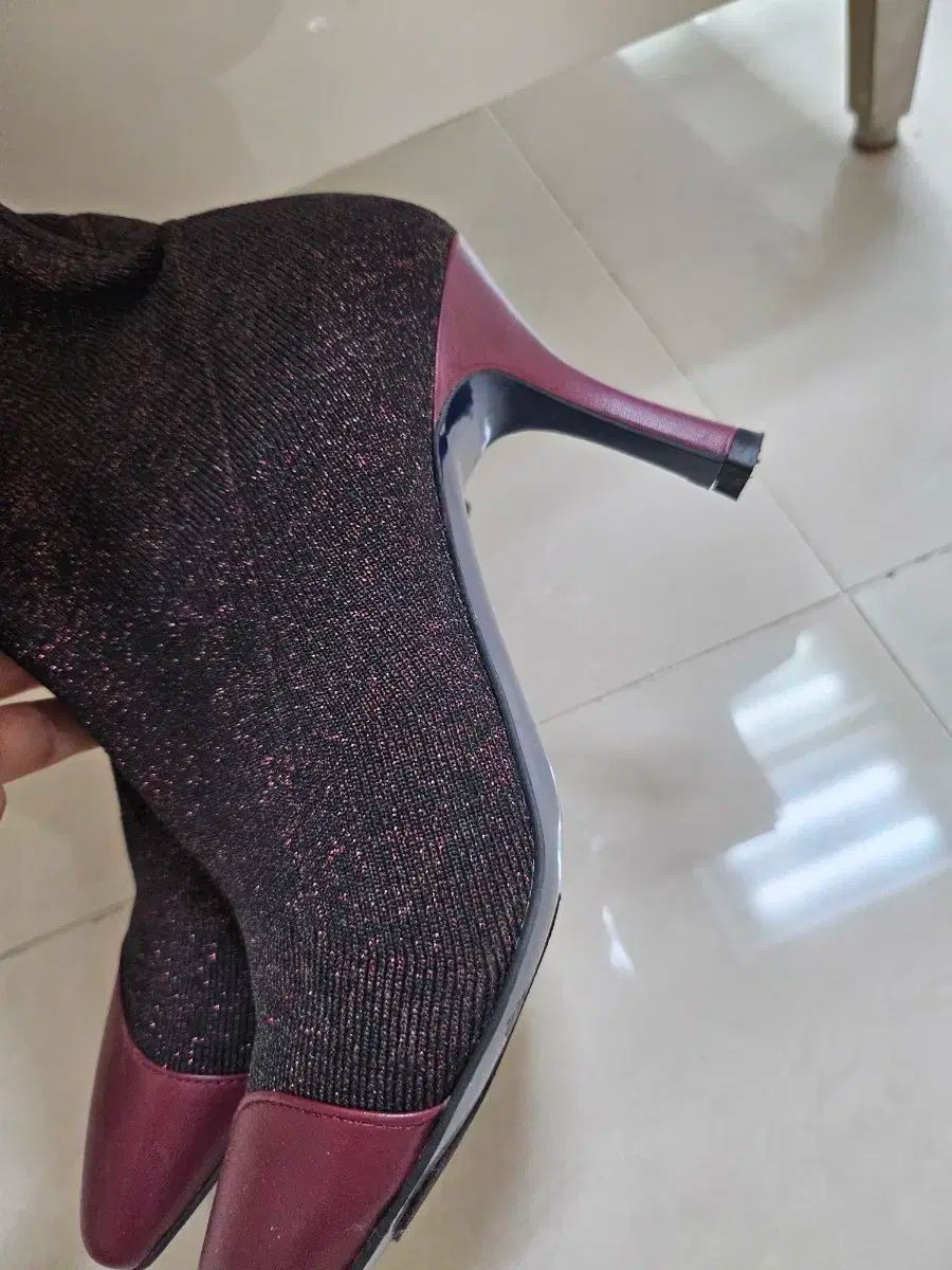 シューコンマボニー ソックス アンクルブーツです。つま先はバーガンディ カラーで ポイントになっています。しっかり素材のソックス(ニット) スタイルなので足首をスリムにフィットさせてくれるので ラインがきれいに見えます。特に コメントなければすぐ安全決済をお願いします!