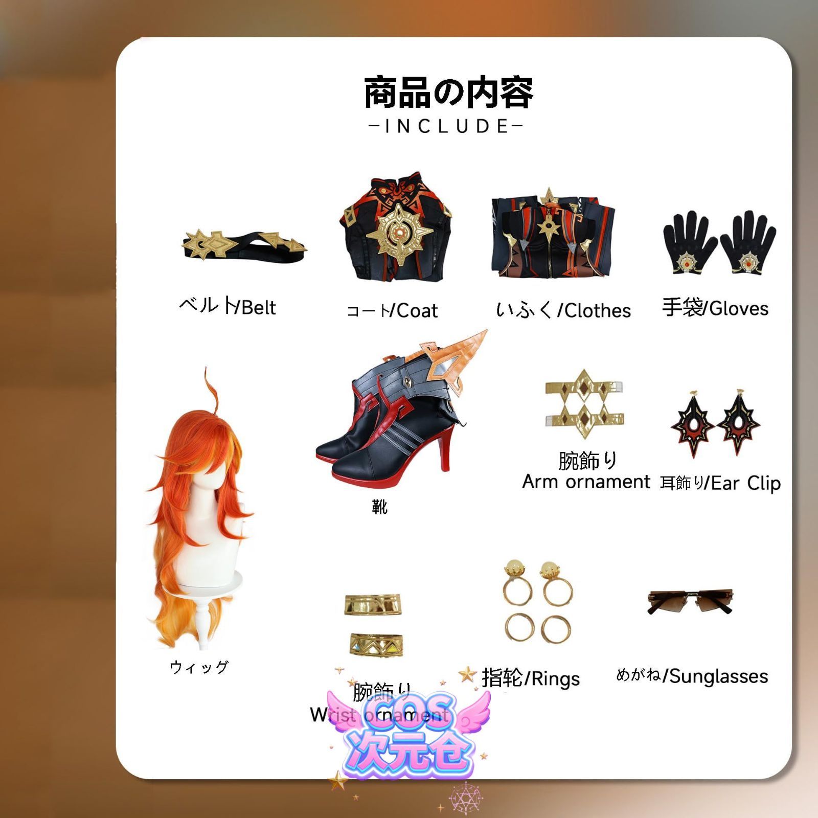 当店のコスプレ衣装につきましては、一部の商品リンクにはウィッグや靴が含まれている場合がありますが、一部の商品リンクの価格にはウィッグ、靴、または武器が含まれていない場合もございます。