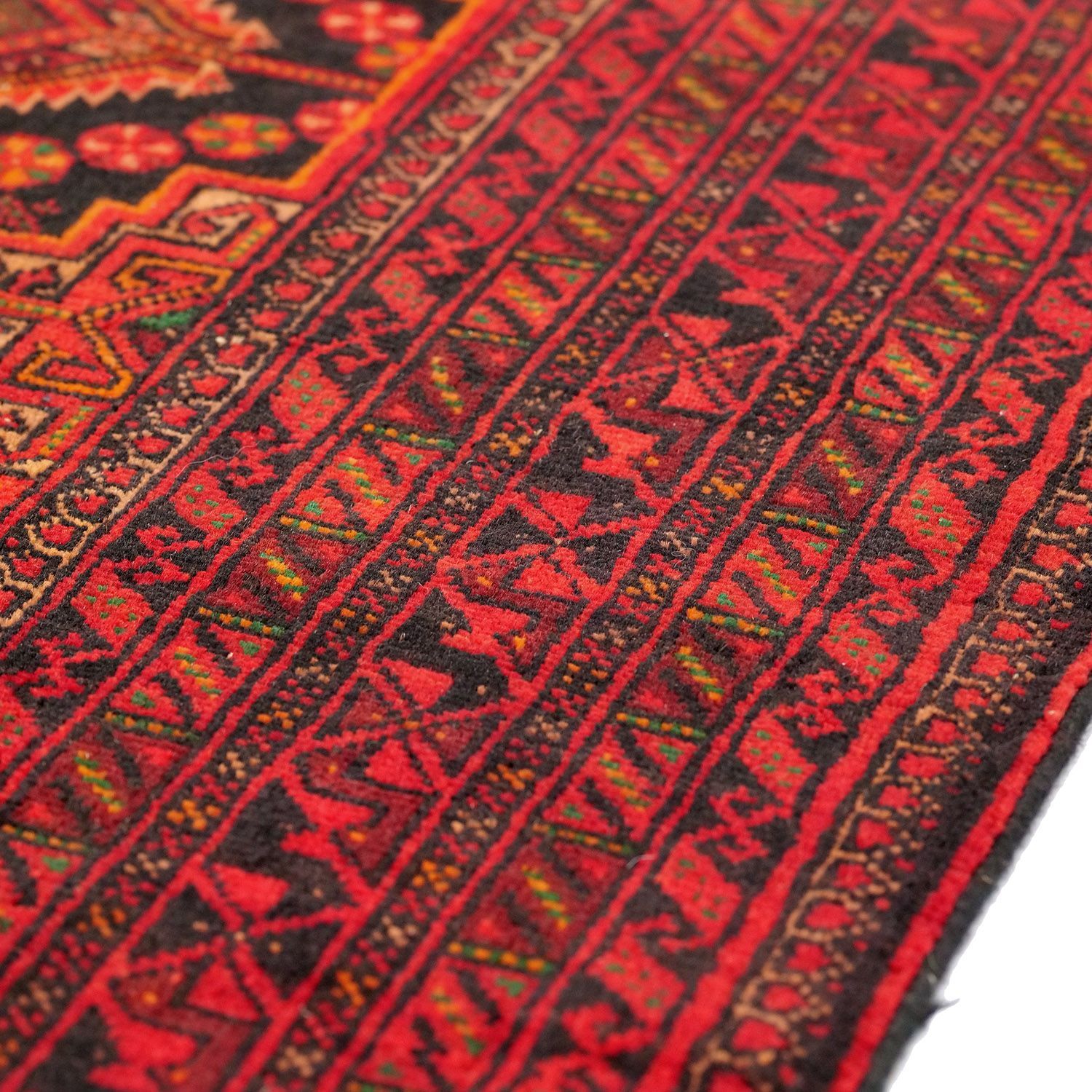 1960年代に制作されたサラルカーニ産のセミアンティークラグです。フィールド全体に規則正しく並ぶダイヤモンドモチーフが印象的で、内部には小さなフックや十字の意匠が織り込まれています。赤と黒のボーダーの対比が美しく、クラシックな佇まいを感じさせます。