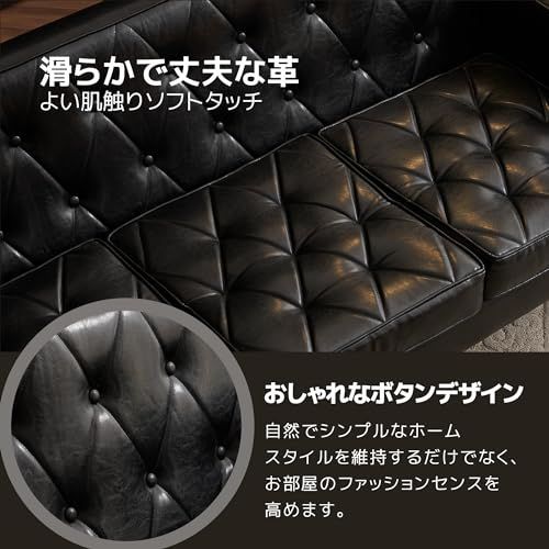 ★【アーティフィシャルレザー】柔らかくなめらかな手触りと上品な光沢が特徴のPUレザー調生地を使用。落ち着いた色味と高級感漂う見た目がエレガントな印象を作り出します。素材には合皮の中でもソフトなアーティフィシャルレザーを採用しました。肌触りもやわらかく、汚れてしまったときもサッと一拭き簡単お手入れでOKです。 ★【掃除ロボットとの相性が良く、座面のお掃除もらくちん】ソファー周りの掃除がしやすい高さ23cmもある木脚、ソファー下はロボット掃除機も余裕に入ります。 ★【安定性と快適性を兼ねた構造】座面にはSばねとウェービングベルトを使い、適度な弾力とクッション性を持たせながら、ベッドとしての使用でも約300kgの耐荷重があるので安全にご使用いただけます。もたれるときに体の側面が当たるひじ掛けにもウレタンを詰め、心地よい柔らかさになっております。本体を動かさないので、女性の方でもらくらく変更可能。