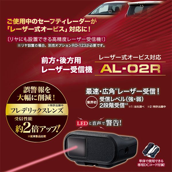 従来モデルよりさらにレーザー光の受信性能が向上したセルスターのレーダー探知機AR-48LAと、後方からのレーザー光受信も警告可能となるレーザー受信機AL-02R、接続コードRO-123のセットです。