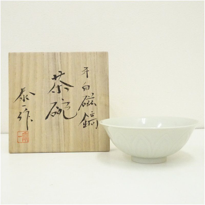 京焼 加藤泰一造 牙白磁鎬茶碗 共箱 茶道 抹茶 おしゃれ 抹茶茶碗 抹茶碗 和食器 レトロ 茶器 骨董 茶わん 茶会 茶の湯