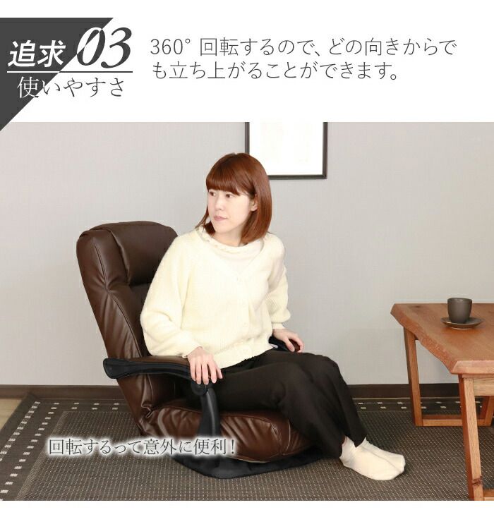 座り心地と使いやすさを兼ね備えた回転式座椅子。360度回転できるので向きを変えやすく、立ち座りもスムーズ。背もたれはリクライニング機能付きで、お好みの角度に調整可能。肘掛け付きでゆったりくつろげ、在宅ワークや読書、ゲーム、テレビ鑑賞に最適です。折りたたみ式で収納も簡単。レザー調の張地が上品で、リビングや和室にも馴染むシンプルデザインです。