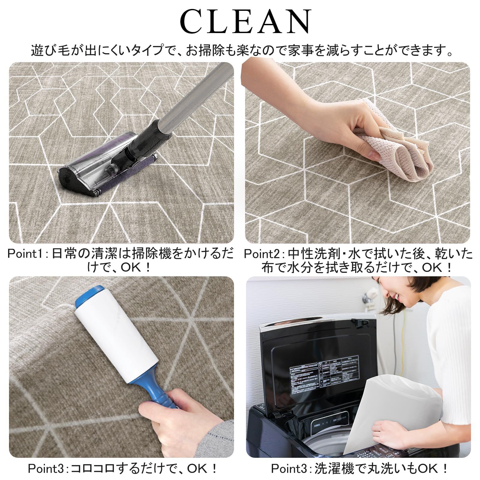 【お手入れ便利】毛足がないので、ゴミが絡みにくく、日常の清潔は粘着クリーナーをコロコロするや掃除機をか けるだけでキレイになります。また、汚れた場合は手洗いや洗濯ネットに入れて洗濯機で洗うことができます(ご 注意:風通しの良いところで陰干しし、アイロン、乾燥機の使用をお避け下さい。)