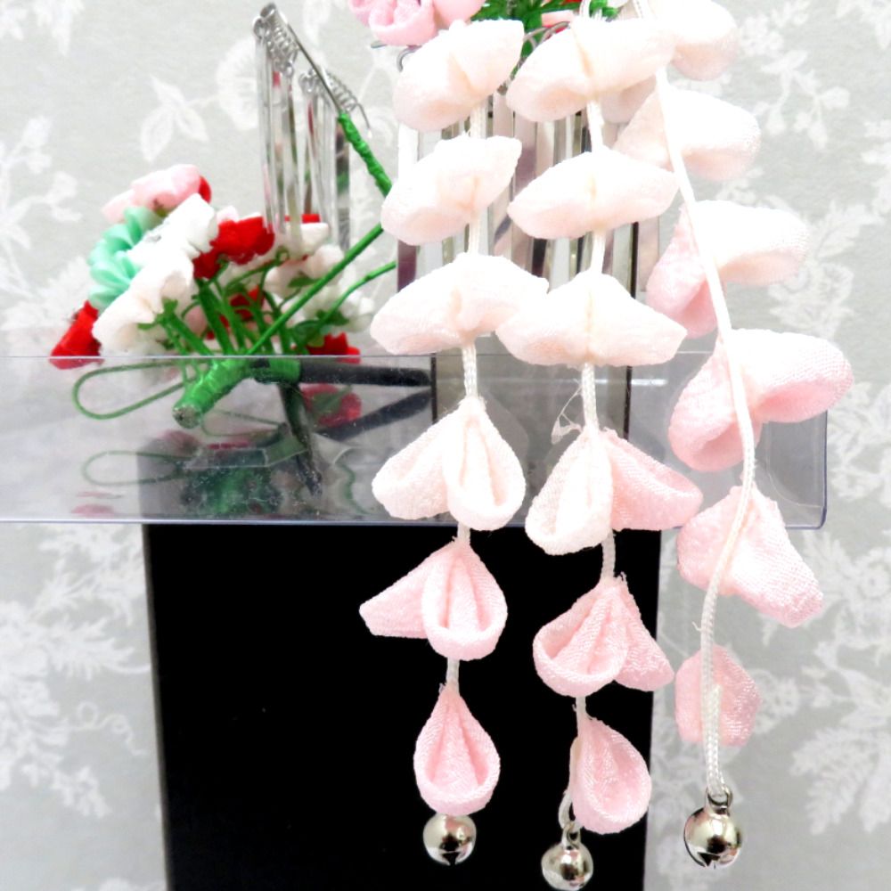 丸つまみの紅白・ピンク・水色の花や動く度に揺れるビラ・可憐な優しい響きの小鈴付きの藤下がりが お嬢様の愛らしい着物姿を より一層華やかに彩ります。