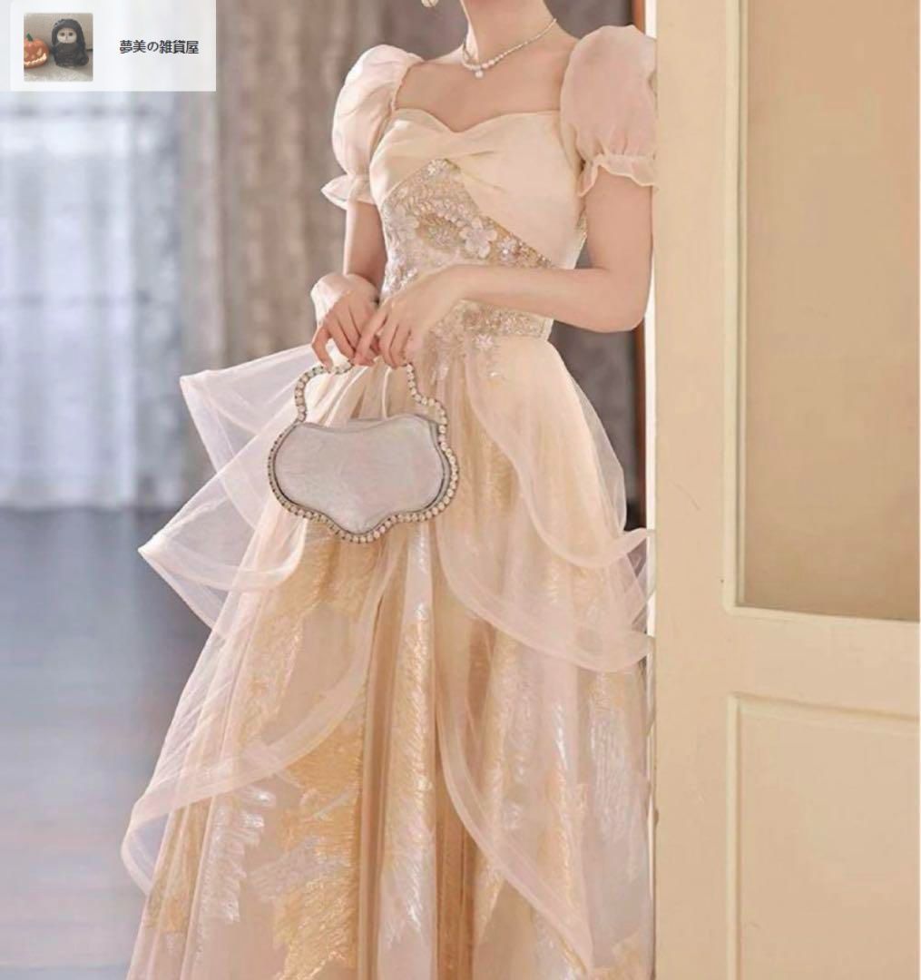 レディースファッション 花柄にフリルのスカートが パフスリーブイブニングドレス