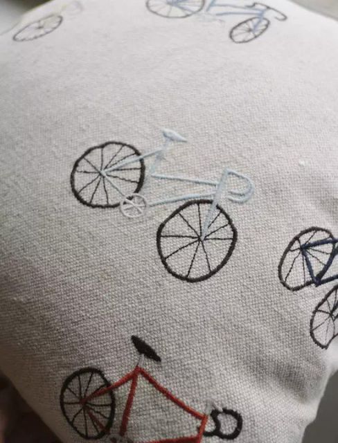 色とりどりの自転車が刺繍された新作クッション・カバー「BICYCLES」。