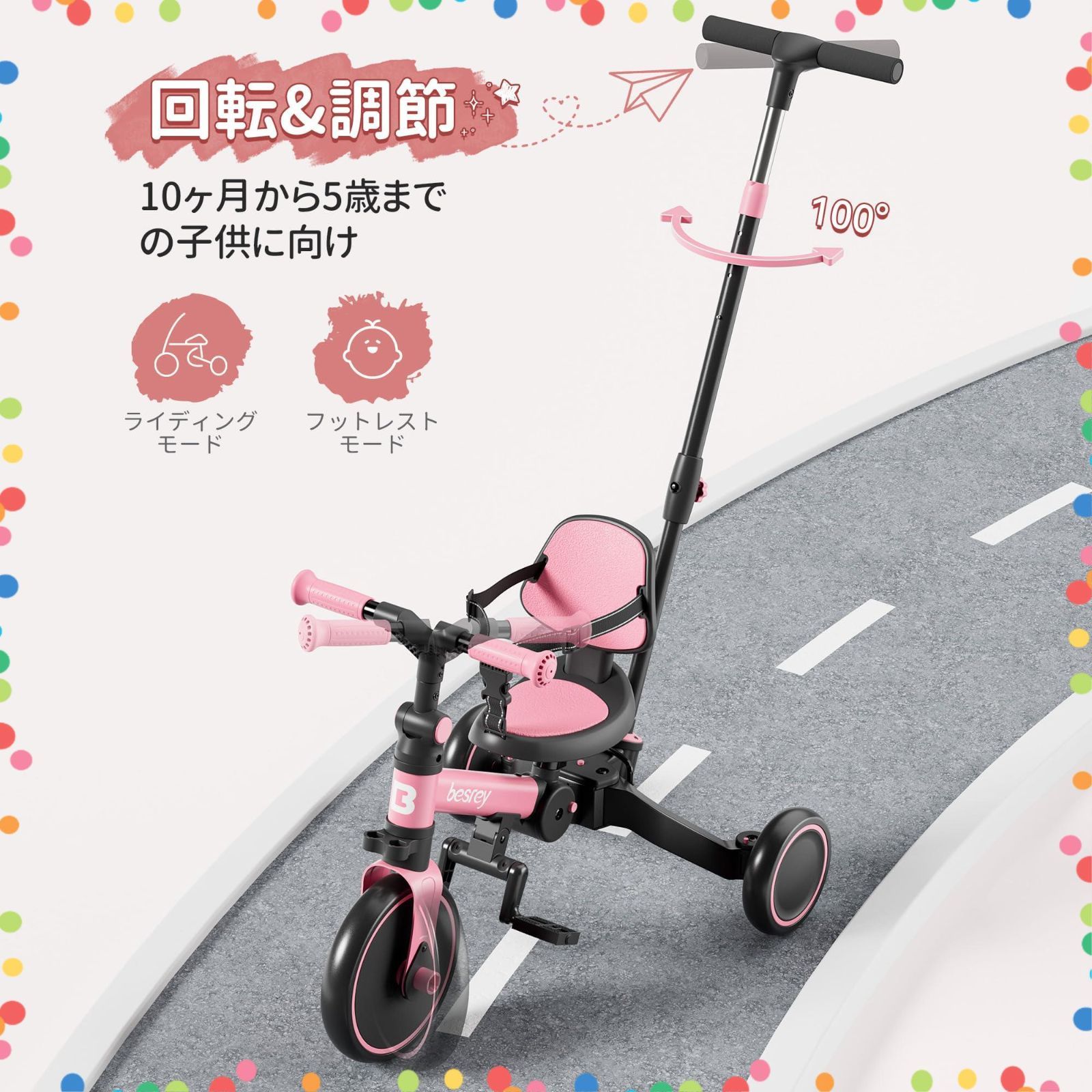 besrey 三輪車 子供用三輪車 折りたたみ かじとり 手押し棒 5in1 1歳 2歳 3歳 ランニングバイク 自転車 乗用玩具 幼児用 キッズバイク プレゼント ギフト ピンク