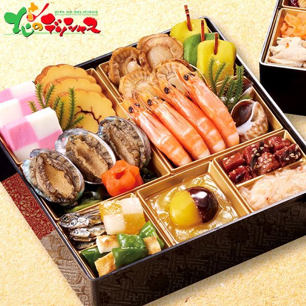 ■一の重 18品目:紅白市松蒲鉾、伊達巻、焼帆立、蓬麩含め煮、粟麩含め煮、味付花こんにゃく、あわび煮、磯わかめ、海老の旨煮、味付バイ貝、田作り煮、金柑百合根市松、万願寺唐辛子と焼京揚の生姜醤油和え、栗甘露煮、渋皮栗甘露煮、きんとん、まぐろ角煮昆布和え、帆刺柚子和え