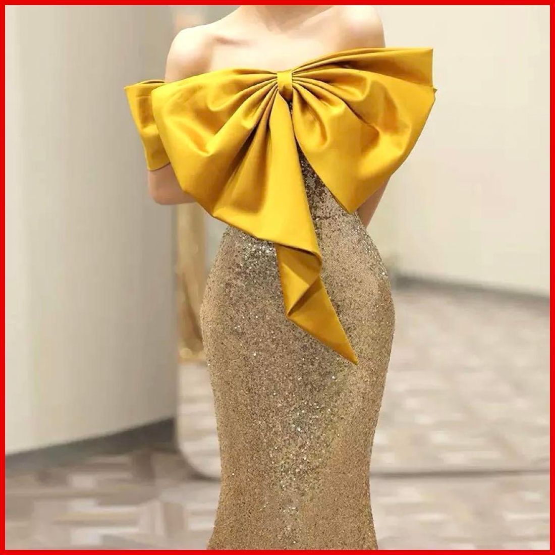 大き目のイエローのリボンが華やかなオフショルダーロングイブニングドレス・?・ ?
