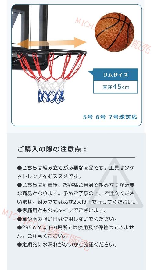 製品説明"工具部品:必要な工具が付き、組み立ては簡単! ご購入の際の注意点: l こちらは組み立てが必要な商品です。 工具はソケットレンチをおススメです。 l こちらは到着後、お客様ご自身で組み立てが必要な商品となります。 ご購入の際の注意点:予めご了承の上、ご注文くださいませ。組み立ては必ず2人以上で行ってください。 l 家庭用とも公式タイプでございます。 ご購入の際の注意点:風や雨の強い日は使用しないでください。 l 295cm以下の場所では使用及び保管はできません。 備考:ボードを含めた高さ:約2.9m~3.65m 天井高が上記サイズ以下の場所では使用保管が出来ません。必ず事前にご確認ください。 ベースタンクに水もしくは砂を入れて使用ください。"