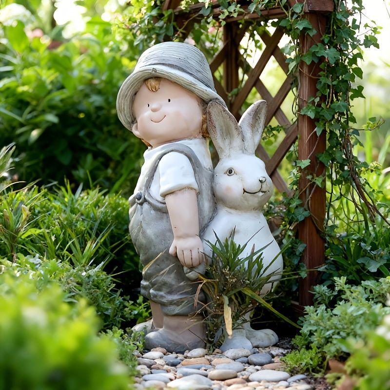 愛らしい少年とうさぎのデザインを施した置物は、あなたのガーデンやインテリアにぴったりの可愛いアイテムです!樹脂製で耐久性があり、屋外はもちろん、屋内のリビングやダイニング、玄関など、さまざまな場所にお洒落なアクセントを加えます。この可愛らしいラビットデザインは、ガーデニングや庭の装飾にも最適で、見る人を暖かい気持ちにさせることでしょう。贈り物にも喜ばれる一品です。