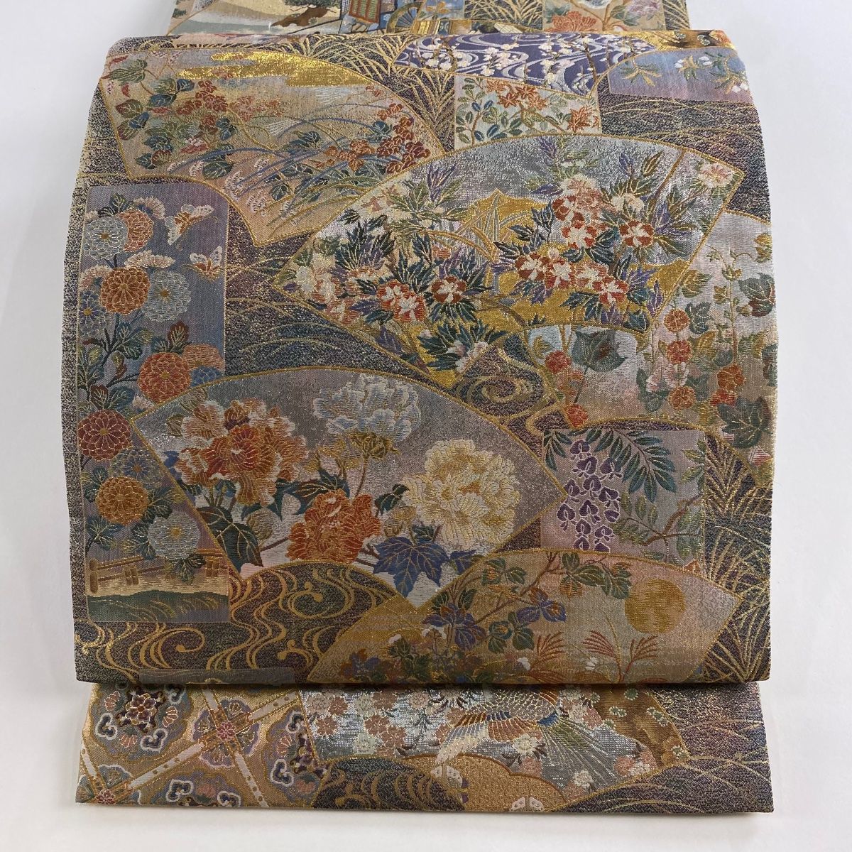 丸帯 壱阡八百口織 伝承国宝図 金糸 プラチナ本金箔 青灰色 全通 正絹