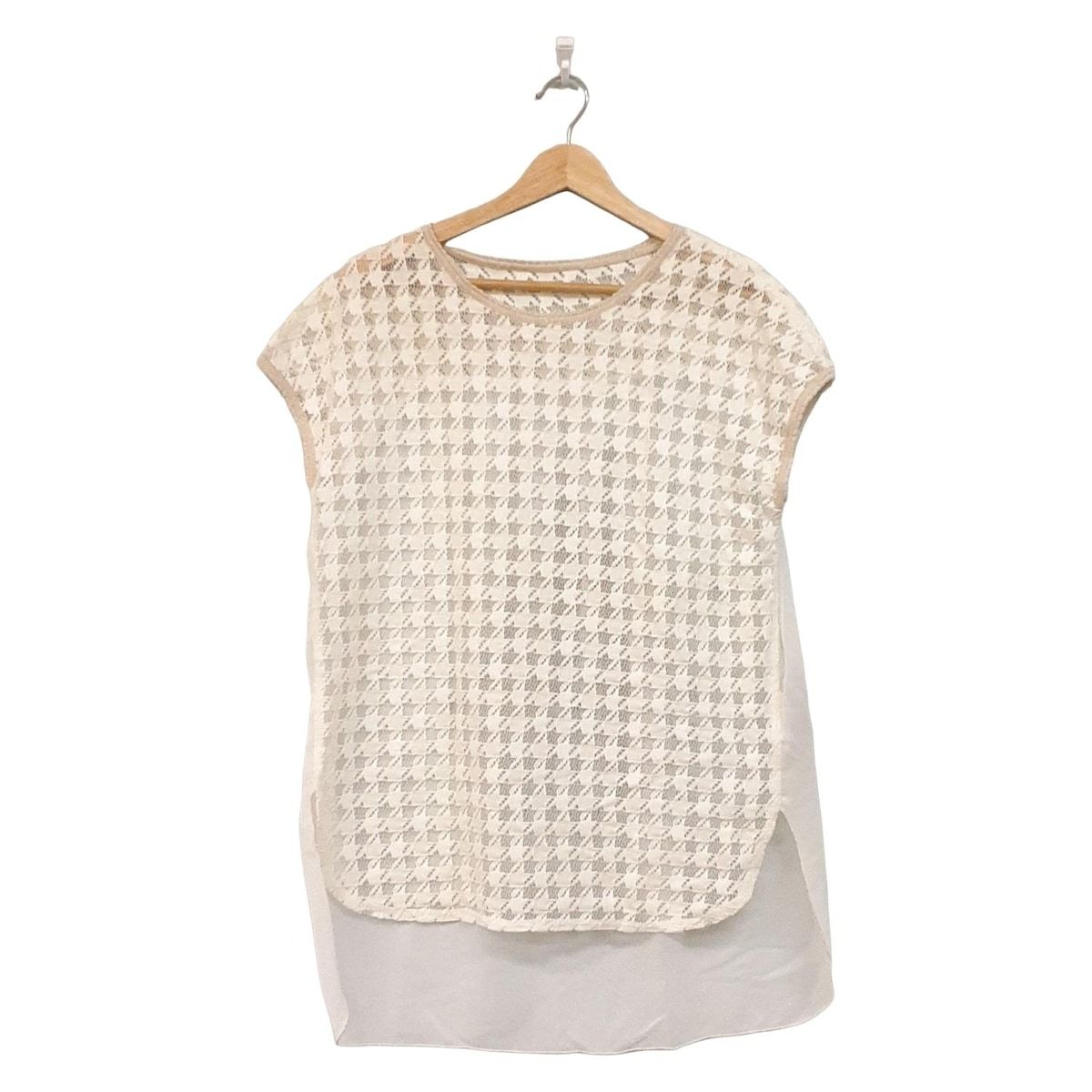 イタリヤ チュニック サイズ9 M レディース - アイボリー×ベージュ クルーネック 半袖 千鳥格子柄 ラメ ラインストーン シースルー
