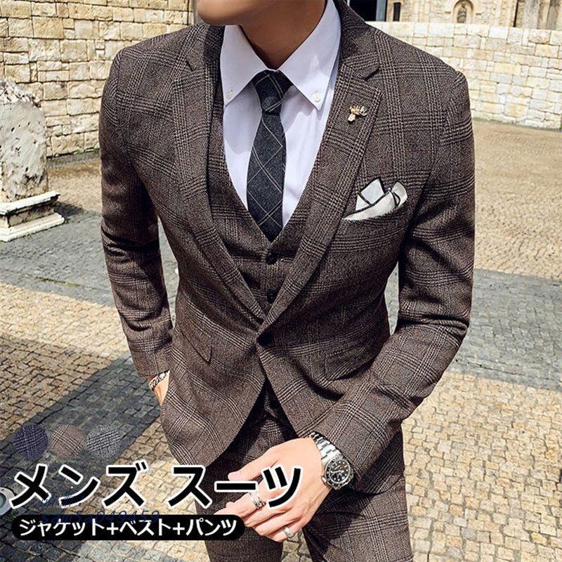 ビジネススーツ チェック柄スーツ メンズ スリーピーススーツ リクルートスーツ 二次会 卒業式 就職活動 イギリス風 スタイリッシュスーツ am 5 a 049459