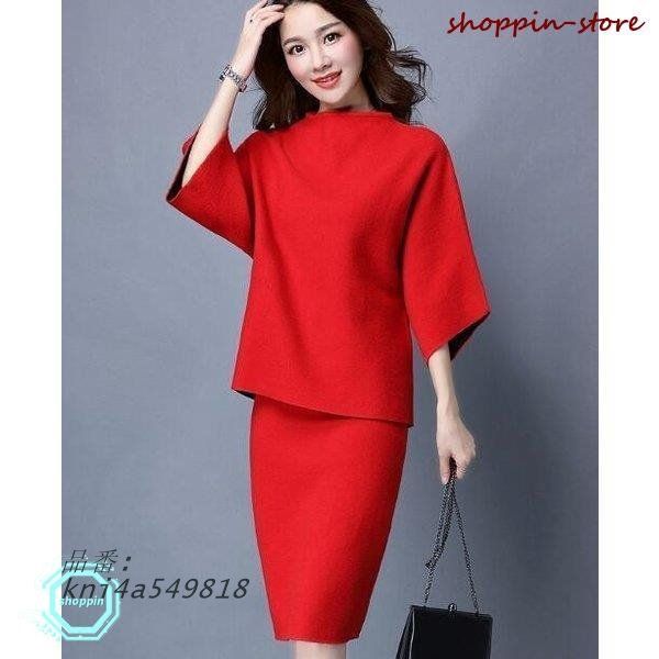 セットアップ レディース ニットウェア トップス プルオーバー 七分袖 膝丈 タイトスカート ウエストゴム バイカラー 2点セット 通勤30代 40代 秋冬