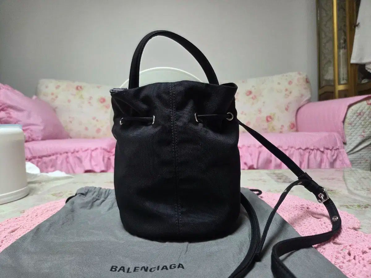 ブラック カラーのバレンシアガ バケットバッグです。キャンバス 素材で軽く持って歩くのに良いです。ダストバッグあります
