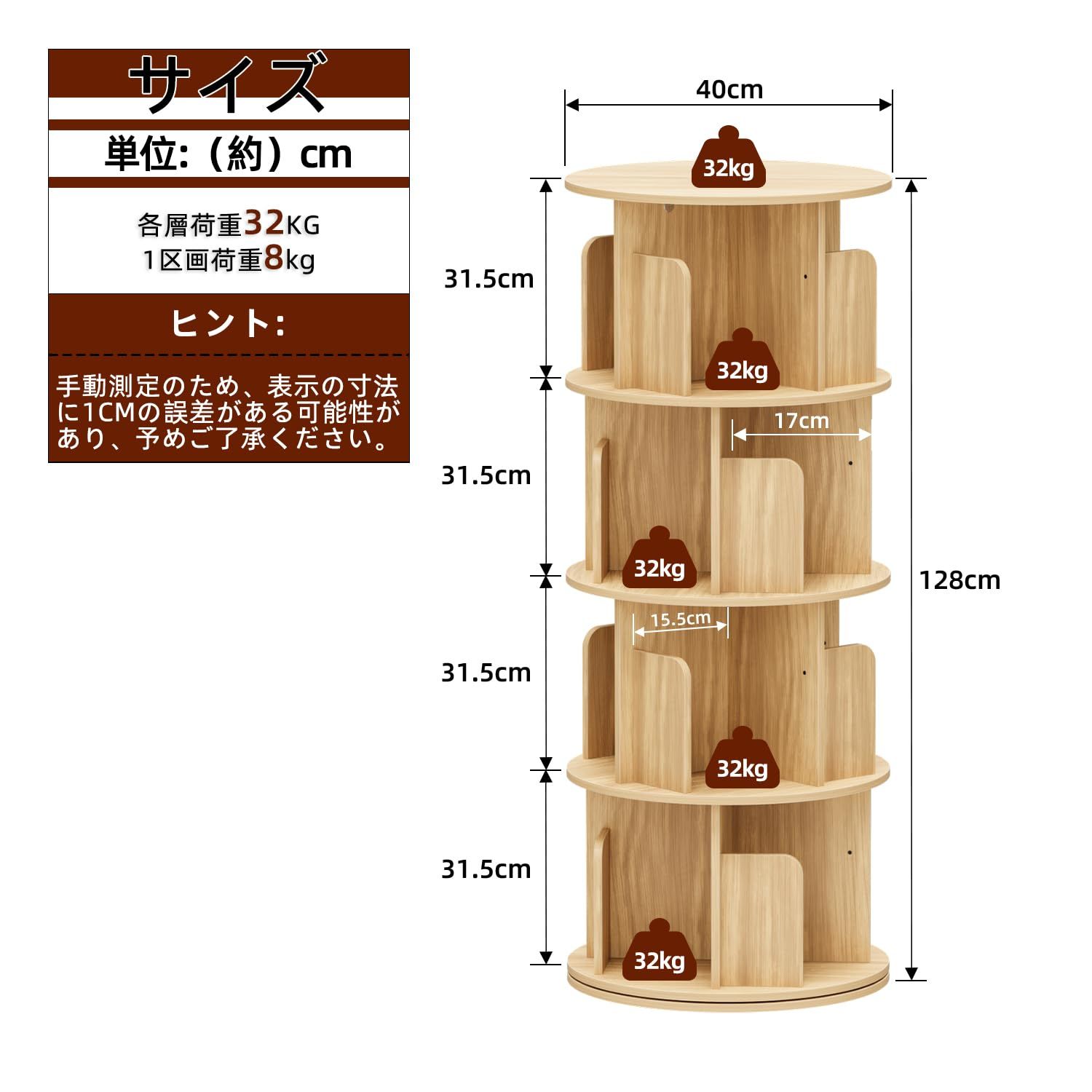 直径40 CM 高さ128 漫画 4段 絵本棚 子供本棚 回転式本棚 CD棚 ラック 大容量 kukeimaru本棚 省スペース ナチュラル
