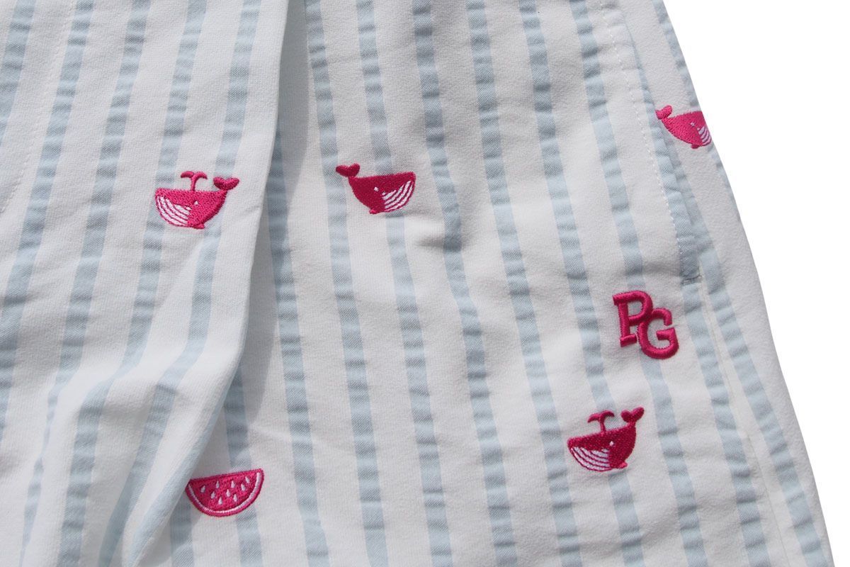 ライトブルーのストライプに、スイカやクジラの刺繍がちりばめられた<パーリーゲイツ>のショートパンツ。