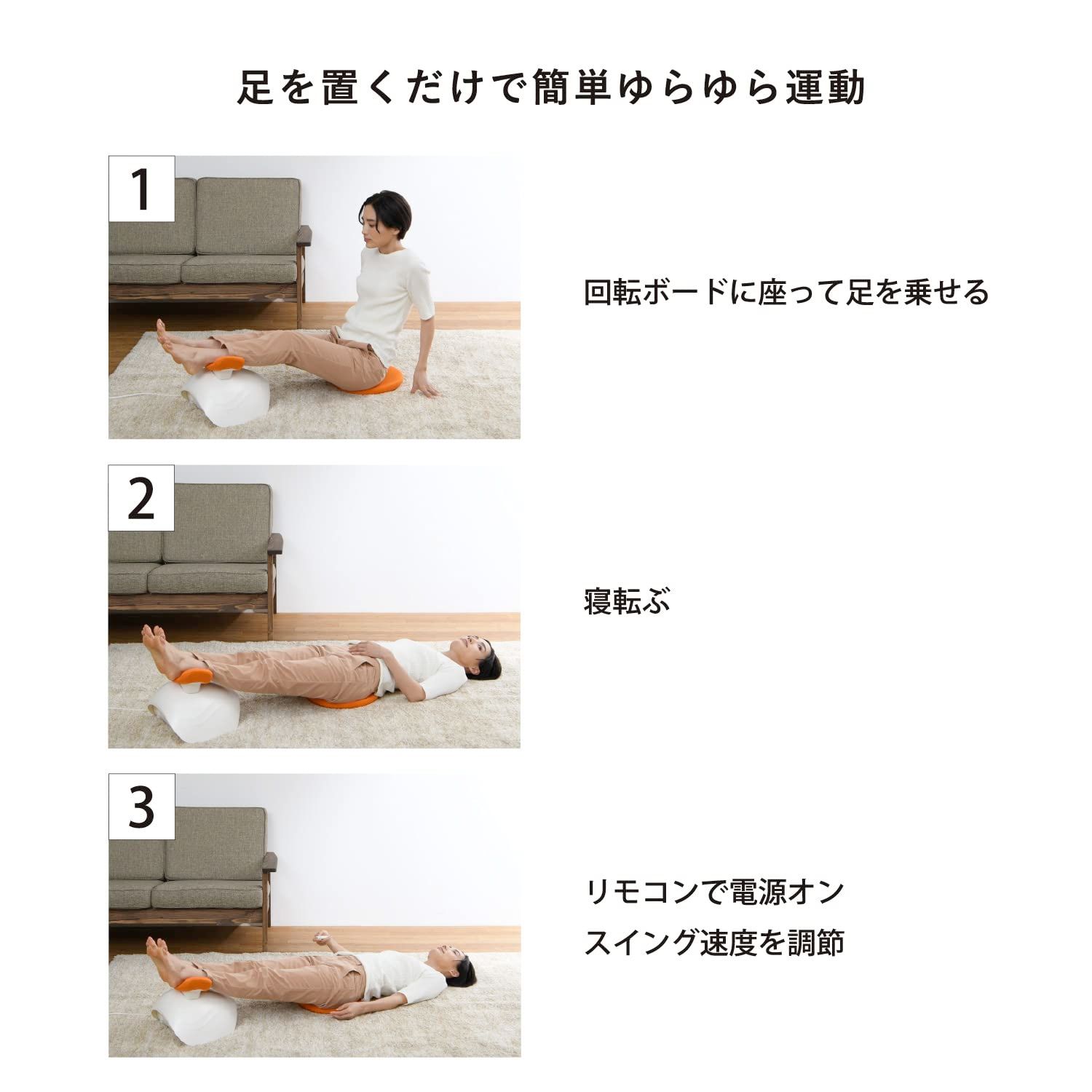 大きくゆらすディープスイング】メトロノームのように円弧を描きながら、足を左右・上下に大きくゆらすディープスイング。日常生活では動かしにくい方向へ足をゆらし、筋肉を伸縮させます。【ゆったりから高速まで5段階のスイング速度】スイング速度は約100回/分~約160回/分の5段階に調節できます。スイング速度はLED点灯で表示されます。【リモコン操作】寝ころんだままでカンタン操作。受信で音をお知らせします。【ゆれを増幅させる回転ボード付き】お尻に敷いて上半身へゆれを伝える回転ボード付きです。お尻と床の摩擦をなくし、回転によって上半身へのゆれを増幅させます。