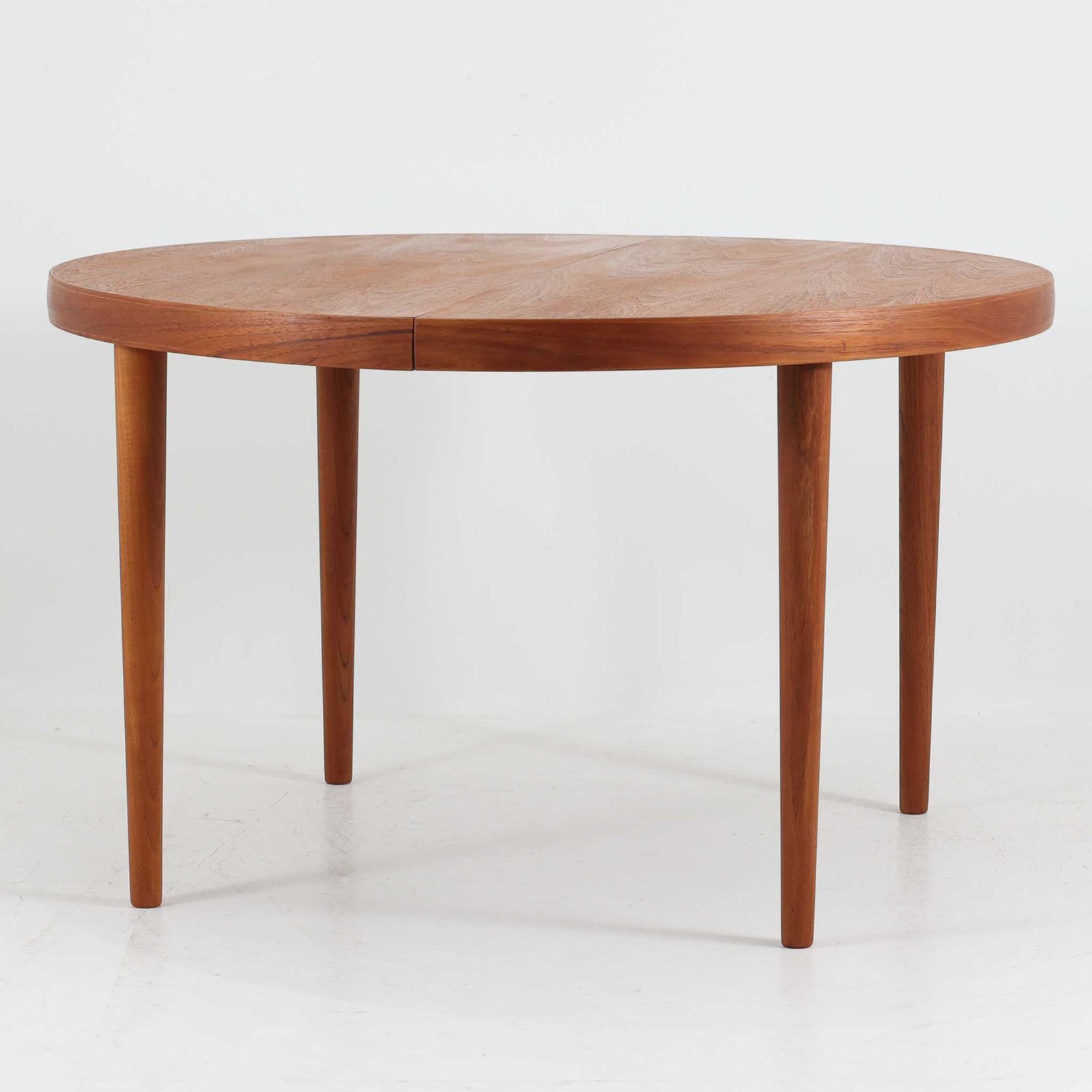 デンマーク製円形エクステンションダイニングテーブルです。チーク材特有の温かみある木目が美しく、滑らかな質感が空間に上質な印象を与えます。幕板と天板が一体化した構造により、すっきりとした見た目と安定感のある構造を両立。天板中央の拡張板を取り付けることで人数や用途に合わせてサイズを調整でき、普段使いから来客時まで幅広く対応します。テーパー脚が軽やかな印象を添え、経年で深みを増したチークの色合いが北欧ビンテージならではの魅力を引き立てます。