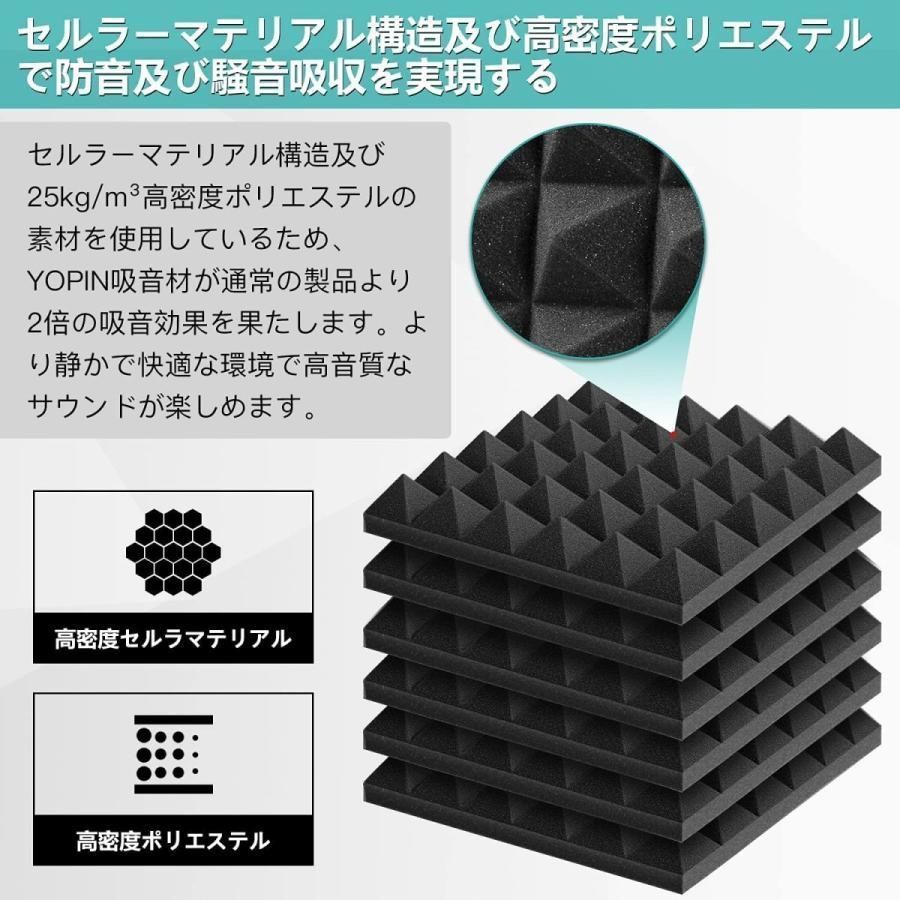 【優れた素材】専門的な音響学によって設計されて、メリットは以下:(1)ウェッジ形構造及びピラミッド形構造で要らない反響音・残響音が減少、吸収され、吸音効果に優れています。(2)耐冲撃で高反発で変形しにくくて、衝撃からしっかり守ります。(3)断熱材料としても良い。多孔質なウレタンフォームの中に空気があり、外からの熱量を遮断し、同時に室内の温度を保ちます。