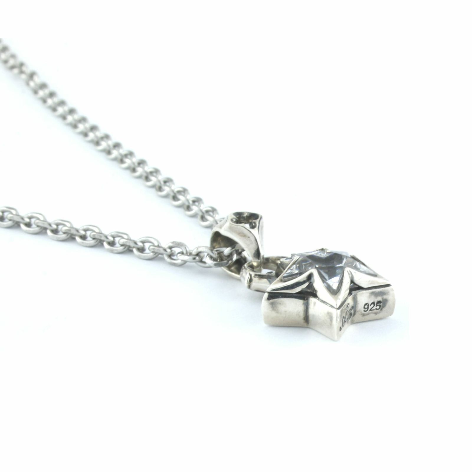 A precisely cut five-point clear CZ sits in a high-polish sterling-silver frame, giving compact proportions a confident presence at the collarbone. The bail features a classic tracery motif, while star-shaped openwork on the reverse draws in light so the piece shifts and shimmers as you move. Minimal in silhouette yet rich in finish, it slips effortlessly into any wardrobe.