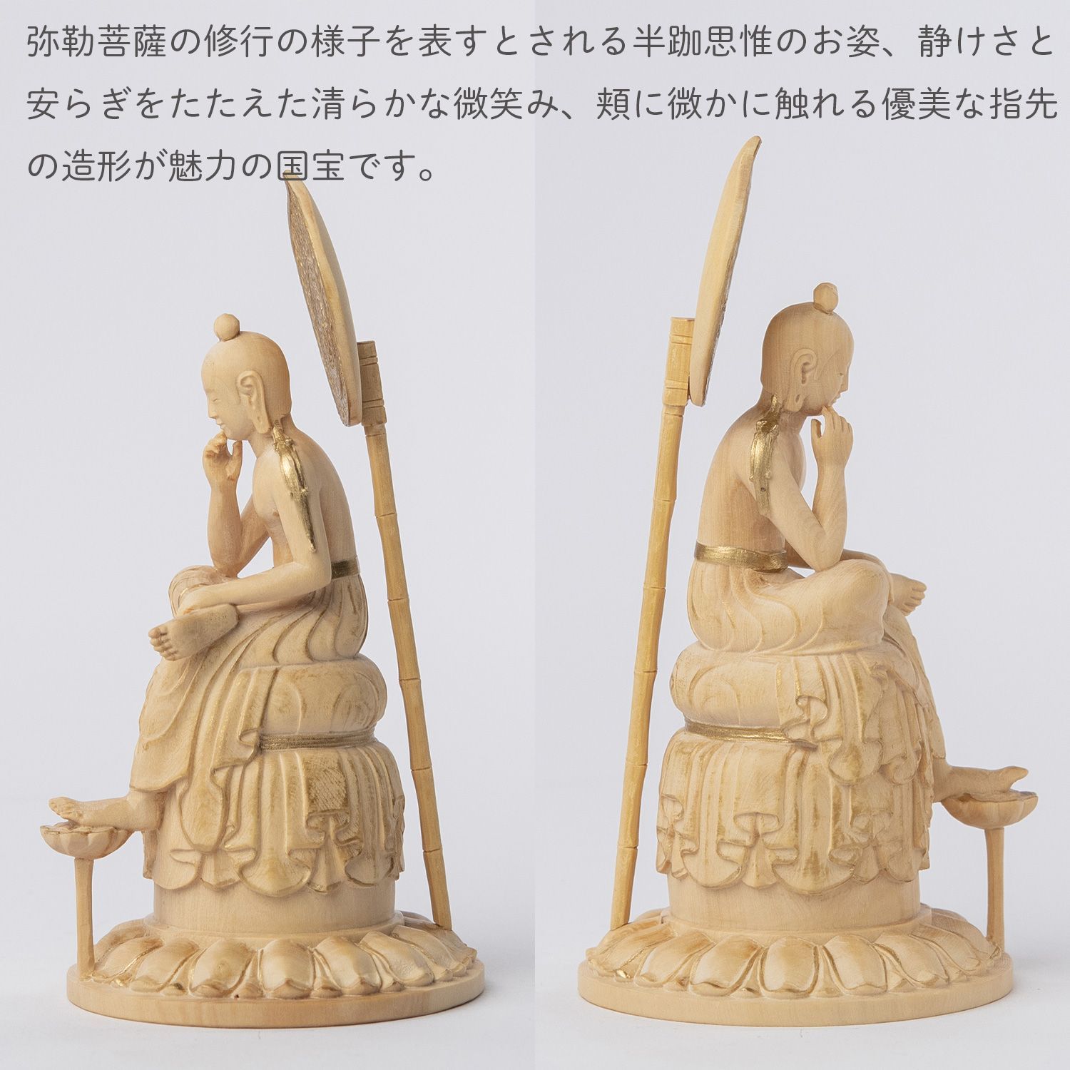 弥勒菩薩の修行の様子を表すとされる半跏思惟のお姿、静けさと安らぎをたたえた清らかな微笑み、頬に微かに触れる優美な指先の造形が魅力の国宝 『菩薩半跏像(伝如意輪観音)』は、わが国のみならず東洋美術史的にも高く評価されます。その柔和な顔は古拙の微笑(アルカイックスマイル)の典型とされ、エジプトのスフィンクス、レオナルド・ダ・ヴィンチのモナリザと並び「世界三大微笑」の一つと賞賛されています。