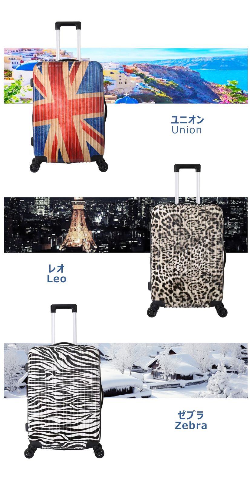 Sサイズのみ スーツケース キャリーケース キャリーバッグ キャリーバー ファスナー 軽量設計 3 選ぶ 修学旅行 海外旅行 旅行 TSAロックプリント柄 ユニオンジャック レオパード ゼブラ