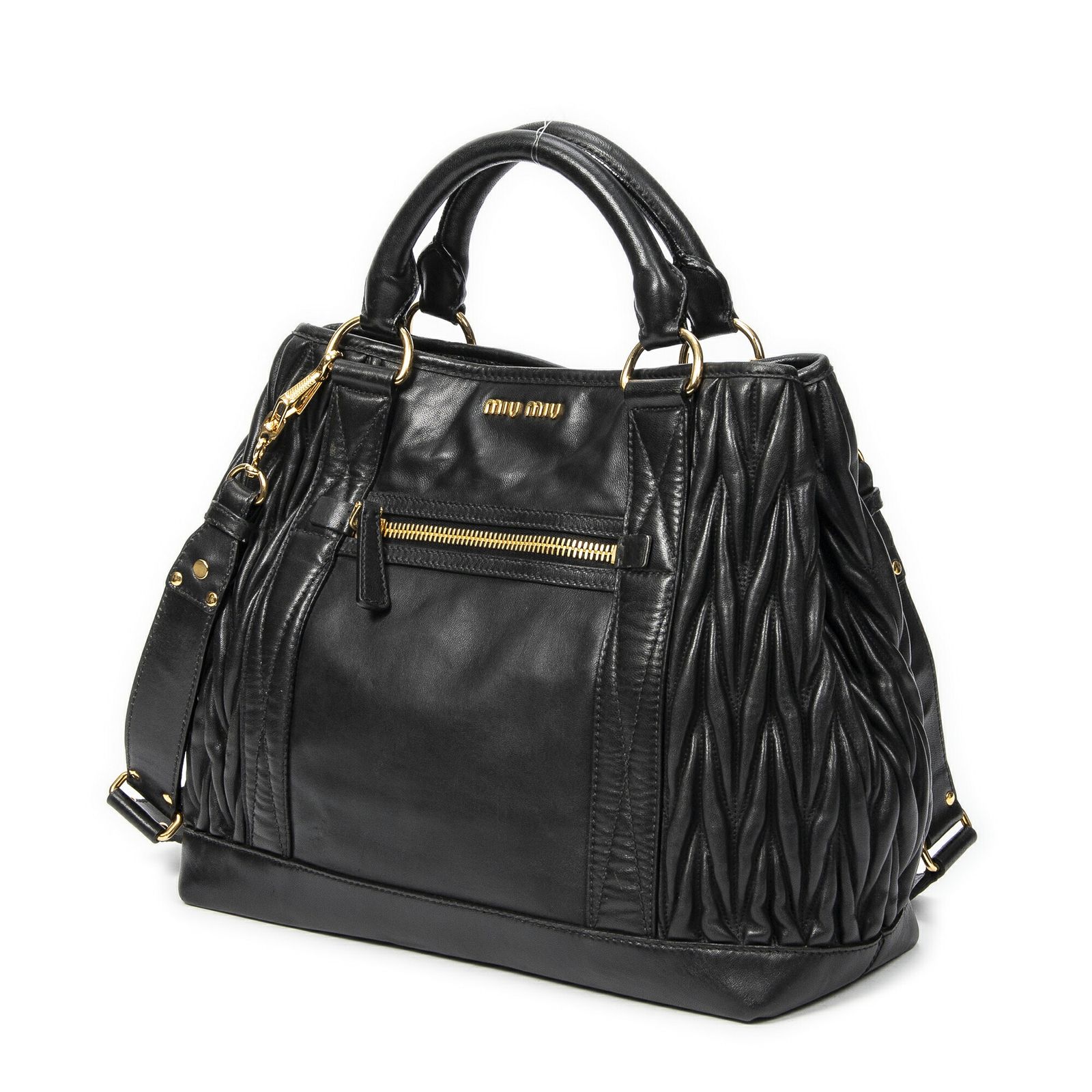 MIU ミュウミュウデニム フロントポケット トートバッグ黒マトラッセレザーA