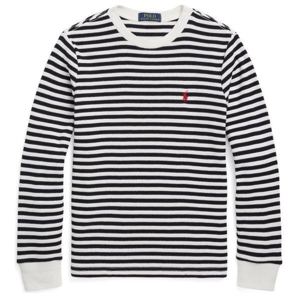 男の子用アイテム。伸縮性にすぐれたワッフルニット生地で仕立てた着心地の良いTシャツ。人気のボーダー柄にポニー刺繍を組み合わせてPOLOらしくアレンジ。