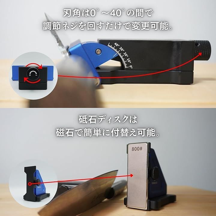 例えば、両刃包丁であれば10°~20°、アウトドアナイフであれば20°~30°、片刃包丁であれば30°~45°といったように、様々な刃物に合った最適な刃付け角度で砥ぐことが出来ます。