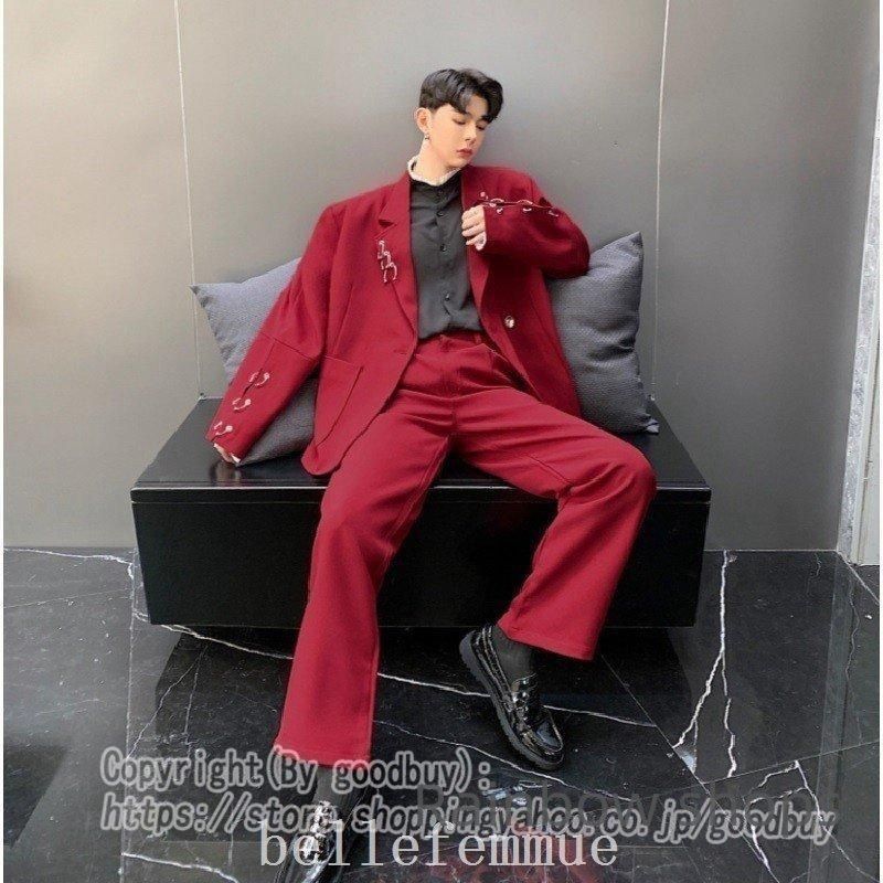 メンズジャケットスーツセットアップメンズ韓国プライベート奇抜個性セットスーツ派手ジャケットパンツ赤レッドブラック dvcp 100