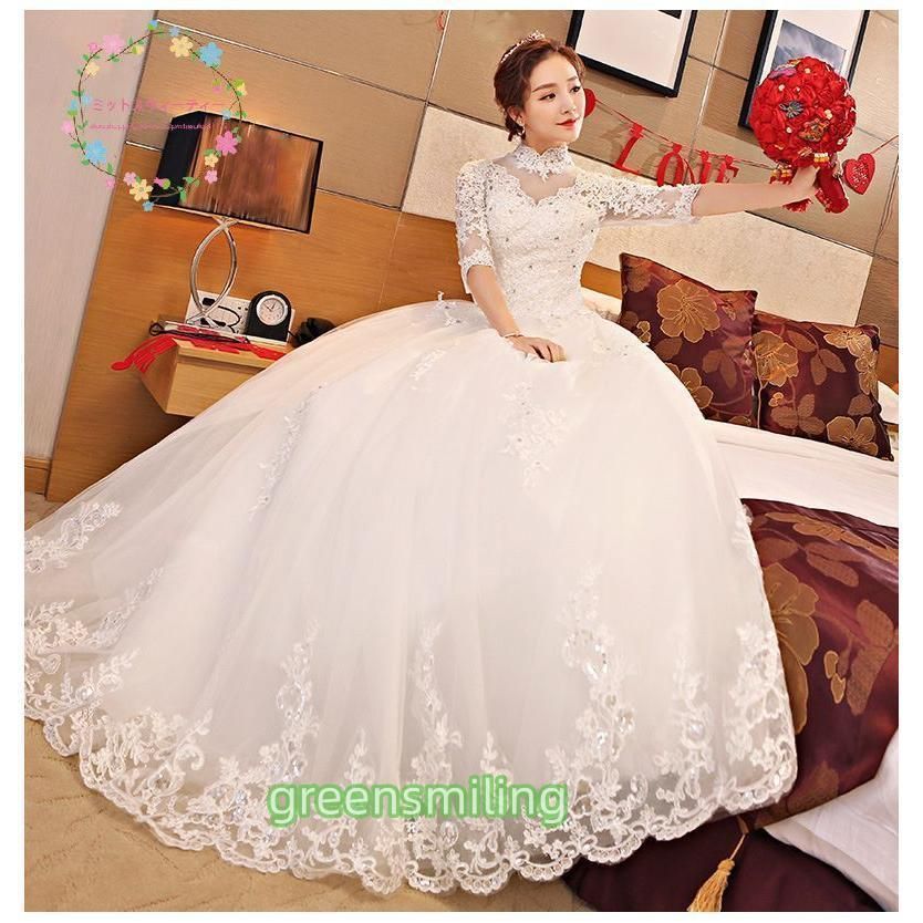 ウェディングドレス 花嫁 二次会 ウエディングドレス 結婚式 ロングドレス プリンセスライン ホワイト 5分袖 前撮り 披露宴 ブライダル