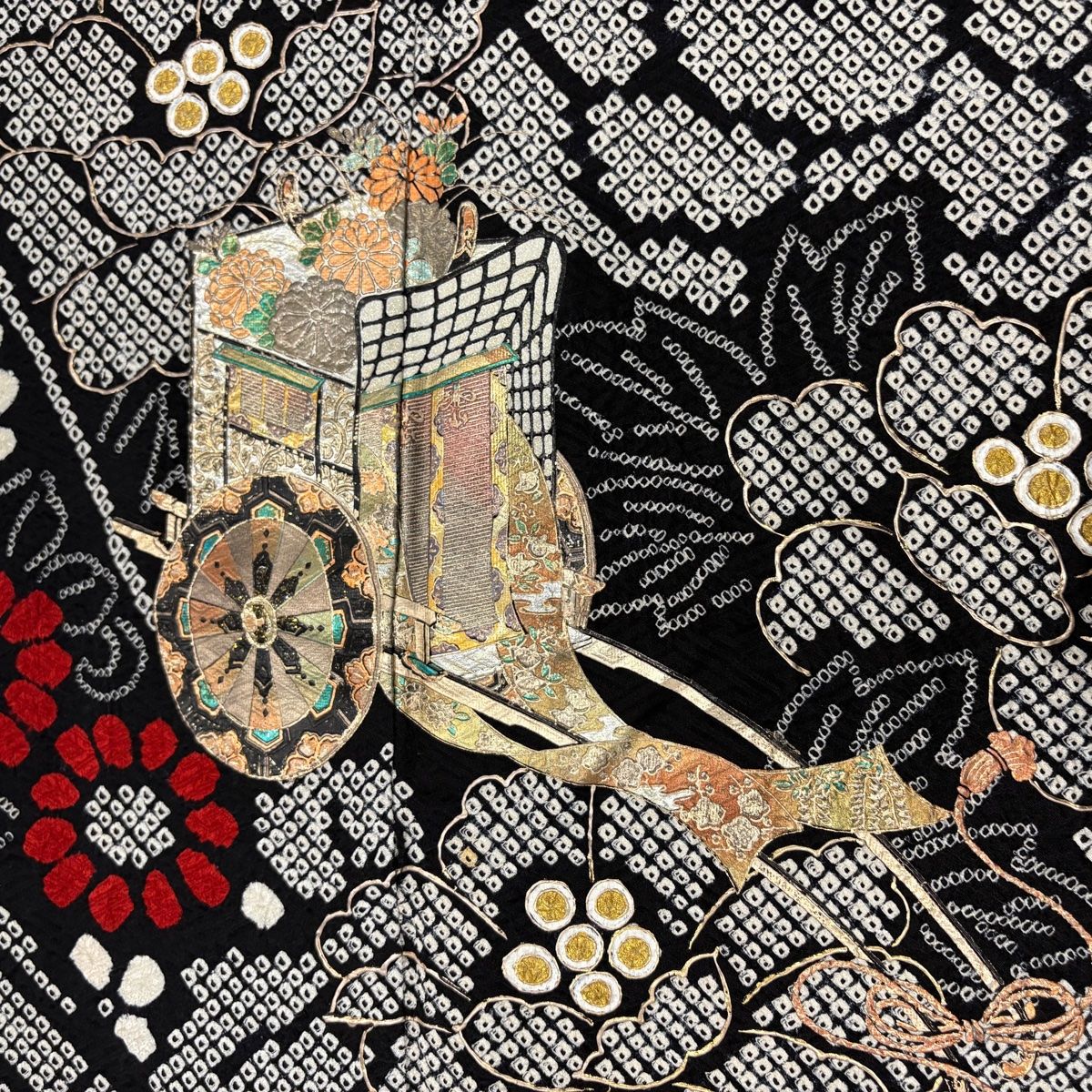 振袖 身丈164 cm 裄丈67.5 L 袷 御所車 牡丹 金銀彩 絞り 黒 正絹 秀品