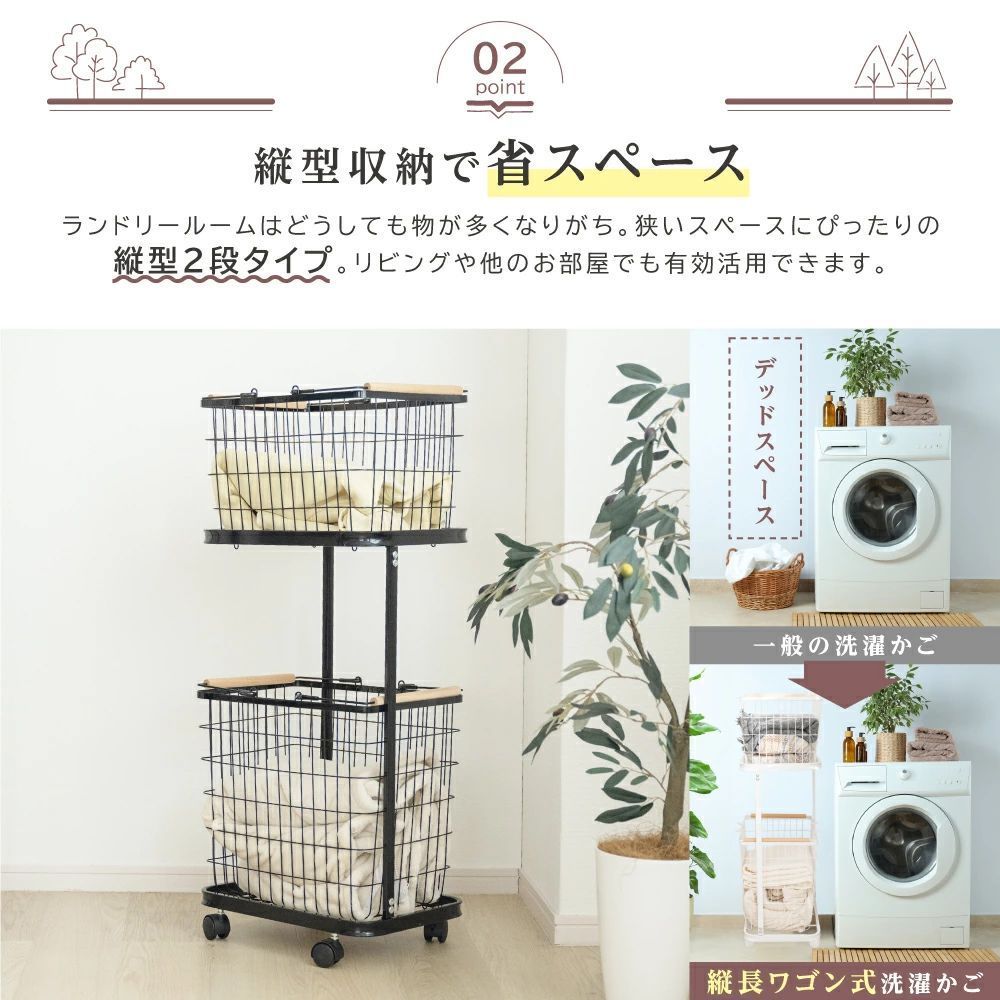 ランドリーバスケット キャスター付き 2段 ランドリーラック 収納ラック 洗濯かご ランドリー収納 洗濯物入れ バスケット スチール 大容量 持ち手付き ワゴン 脱衣かご シンプル 新生活