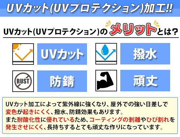 UVカット(UVプロテクション)加工によって屋外での強い日差しで変色しにくくなっています。
