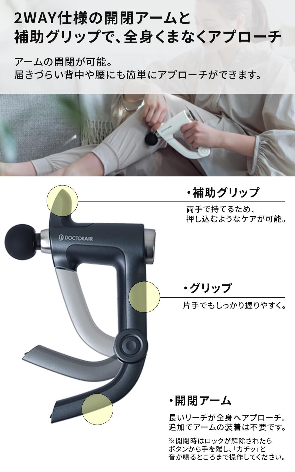 開閉アームで肩甲骨まで届く全身ケアしたい。特に肩・肩甲骨・腰のスイートスポットへのアプローチ。 別途アダプターなどを装着する事もなく開閉アームで届きにくい所でも楽々。