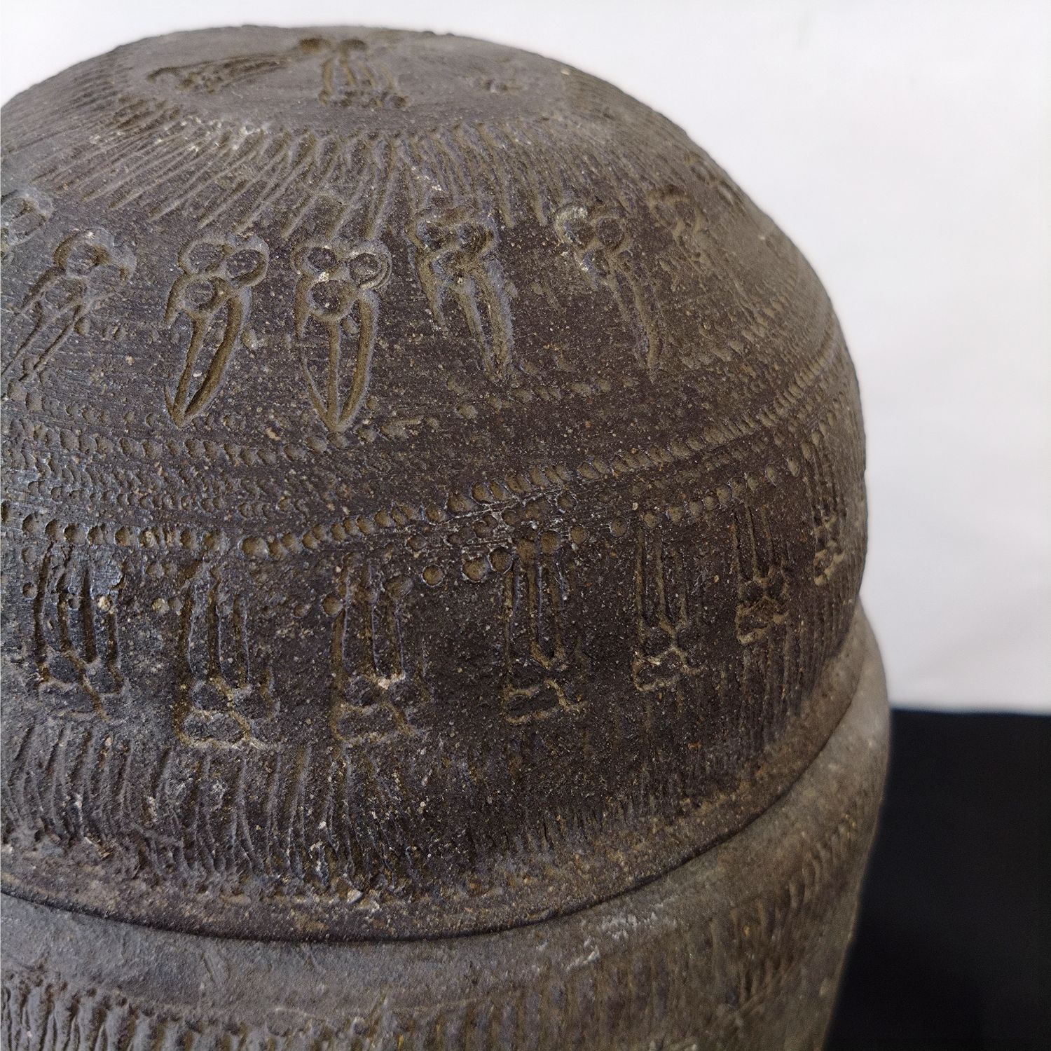 ・素焼きされた土器の形状で、特徴的な文様はスタンプで施されています