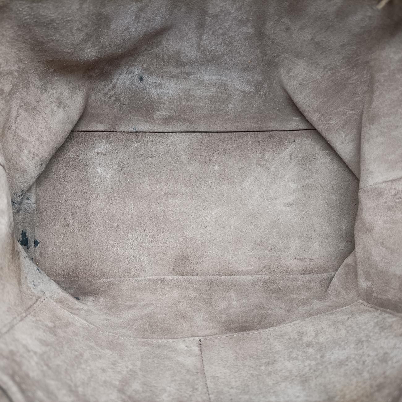 全体の軽度使用跡、胴体を包む軽度の傷、しわ、内側の中等度の汚れ、辺角の軽度補色跡、金属の軽度摩耗、傷、肩ベルト、手提げ軽度使用跡;