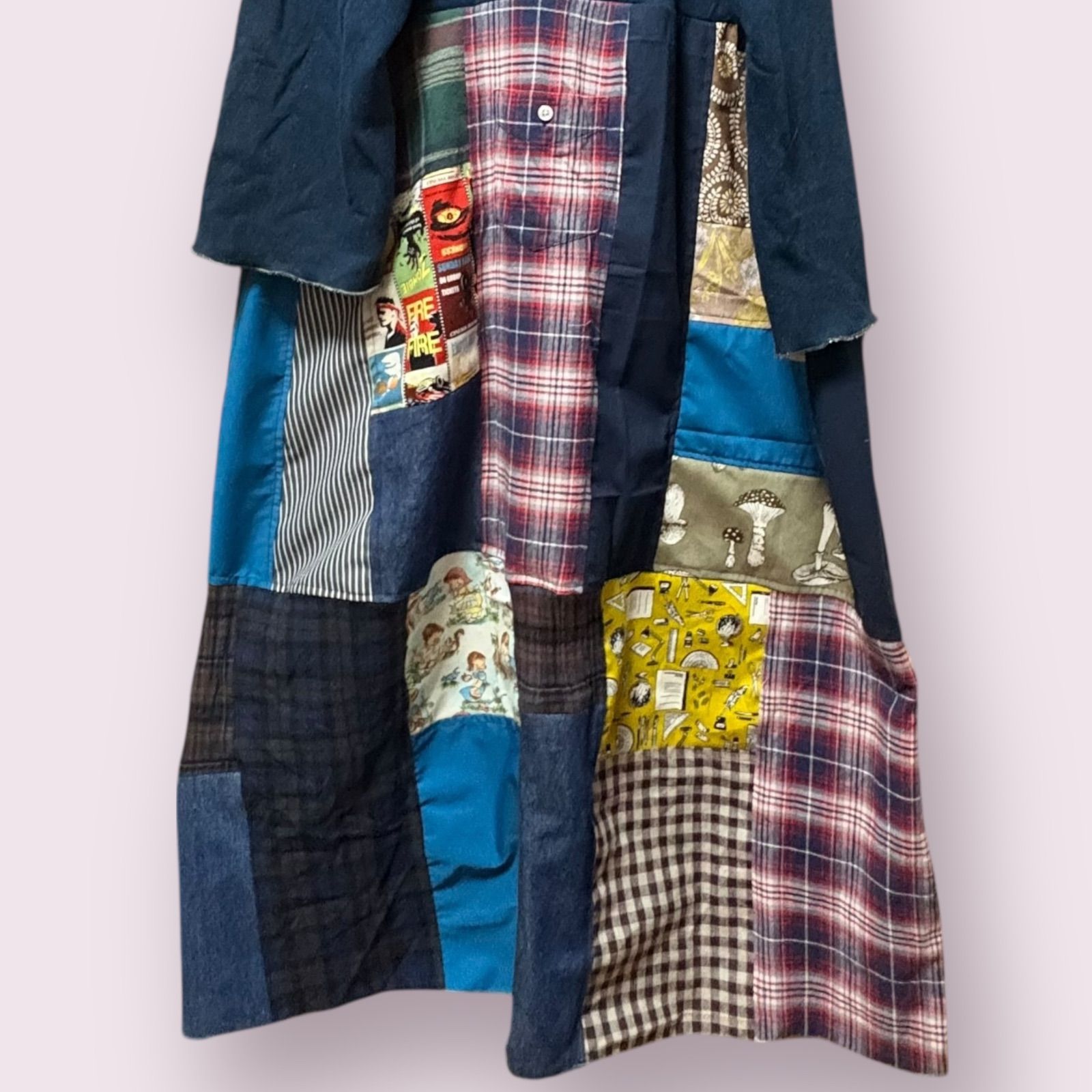 スカート部分は沢山の生地や新品チェックシャツを使ったパッチワークロングスカートを取り付け。パンダ柄・北欧風プリント・キノコ・文房具柄・など。プリント生地などをパッチワークして取り付け。大きなアウトポケットも装飾あり、スマホも入り便利なビックポケットです。