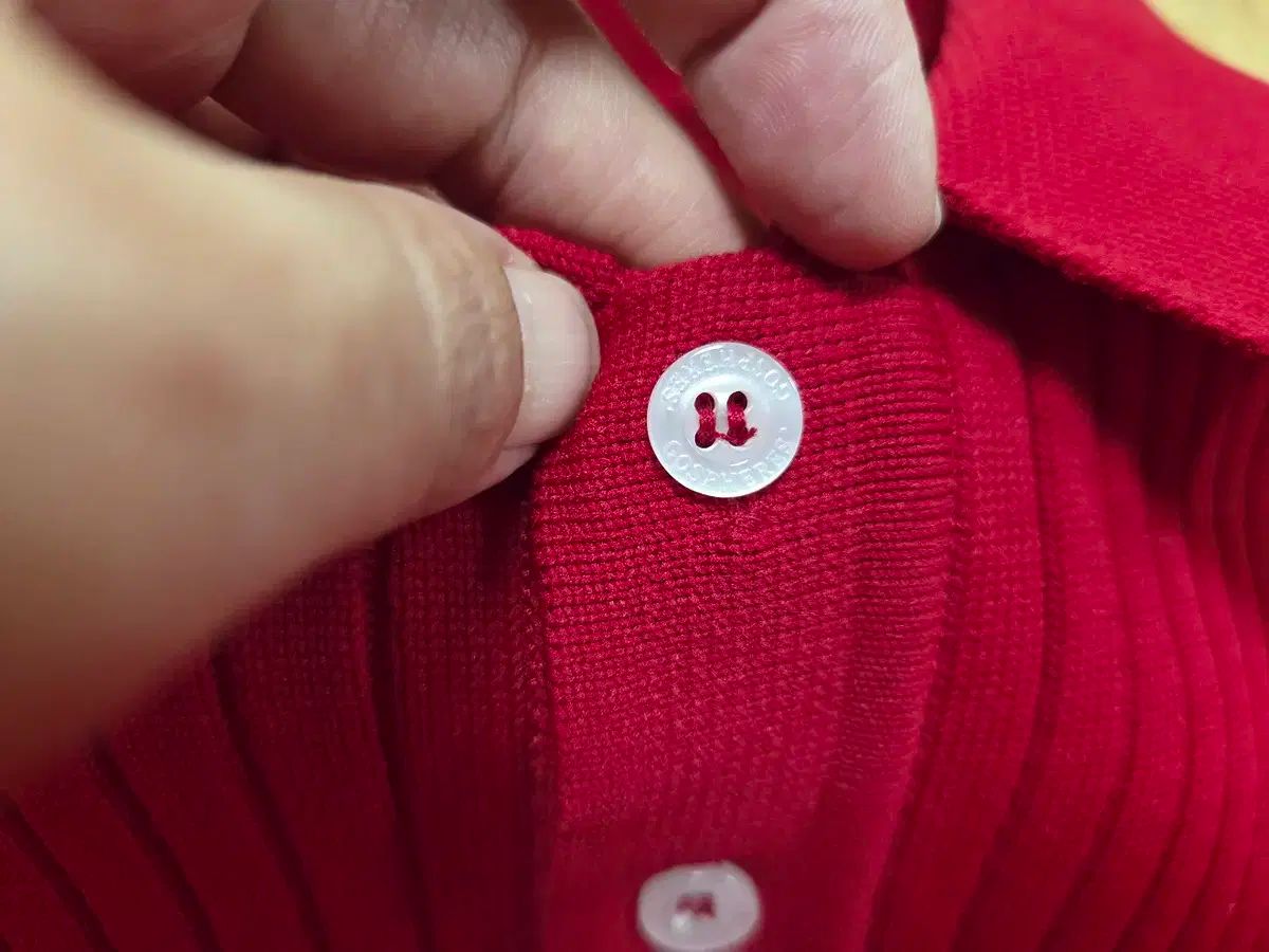 レッド カラーにリップ ストライプ ポロ セーターです