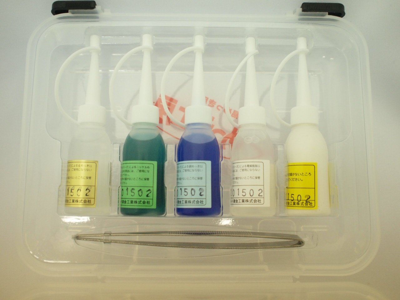 セット内容:プラスチック収納ケース入り/金属磨き・脱脂液・銅・ニッケル・金めっき液 各18ml